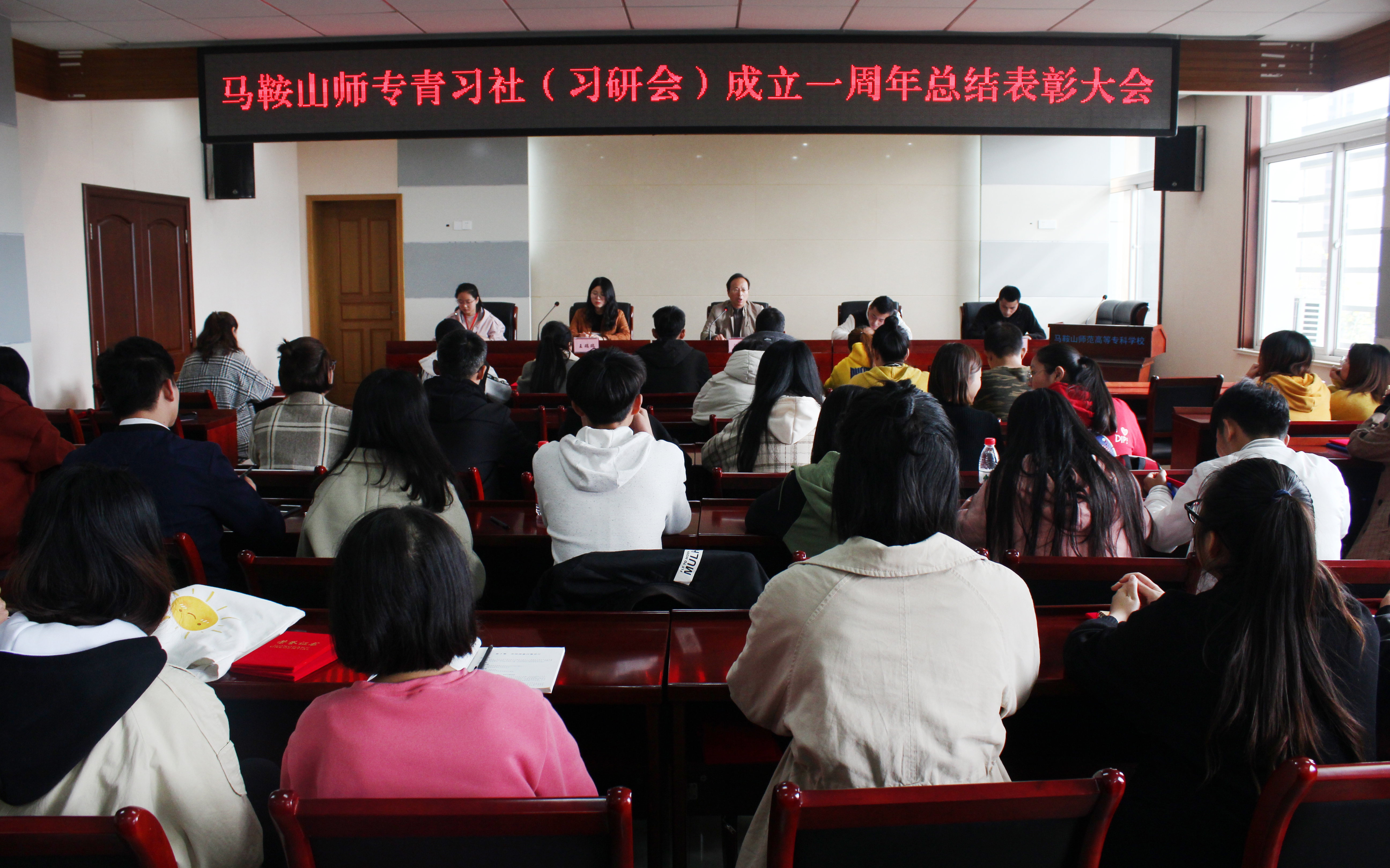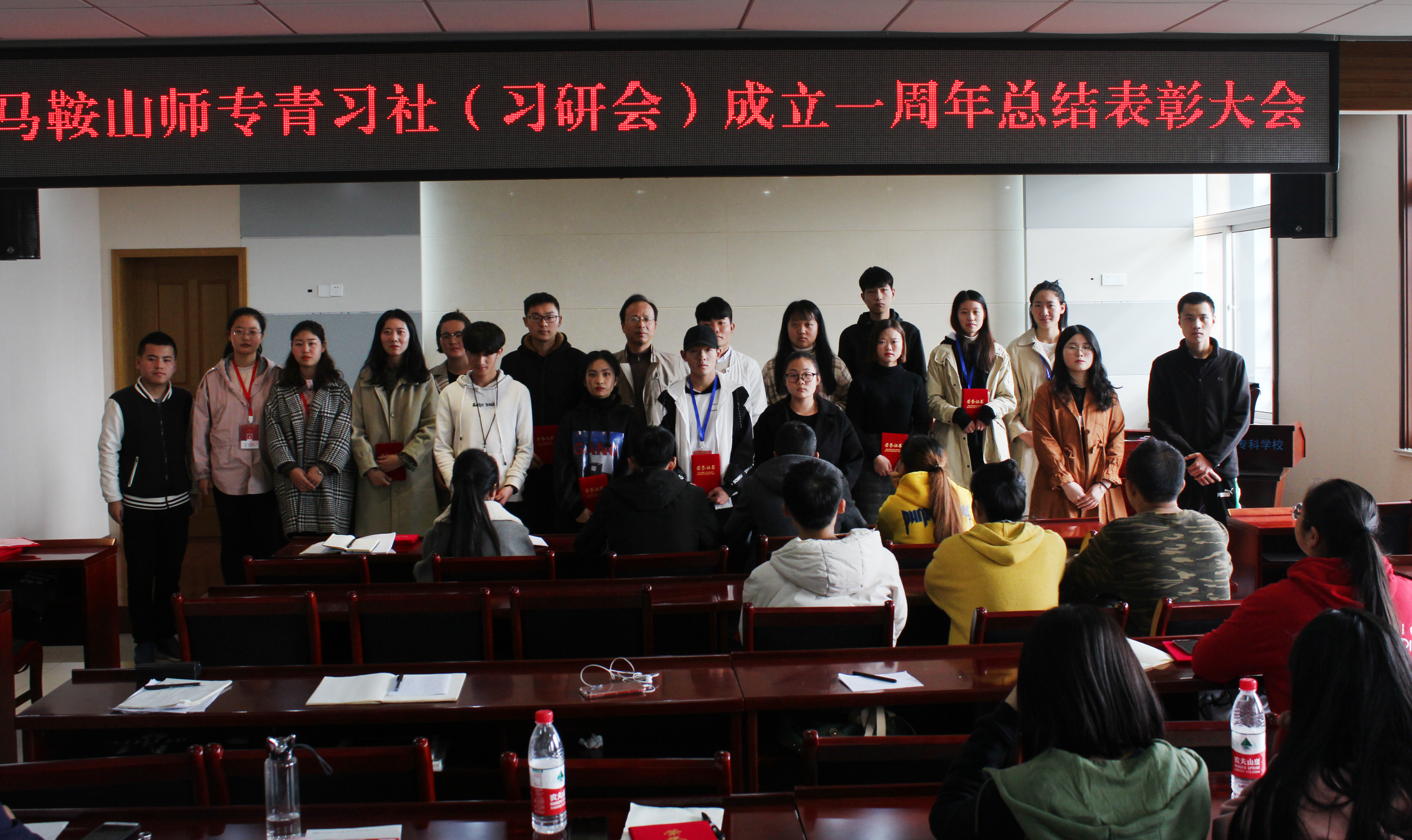 本网讯11月15日中午,马鞍山师范高等专科学校第一届习近平新时代中国特色社会主义思想青年学习社(习研会)举行成立一周年暨“衣”往情深、让爱循环公益活动总结表彰大会。学生处副处长、学工部副部长、旅游与外语系党总支副书记汪志彬应邀出席表彰大会并为学社干部和获奖同学颁发聘书及荣誉证书。